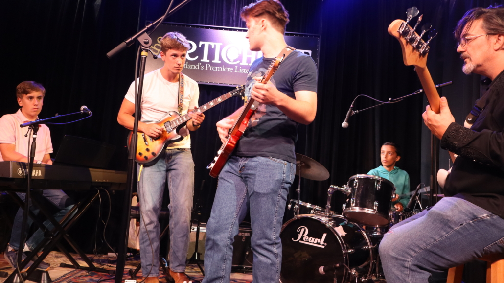 - Instrument rotation—students take turns on guitar, keys, drums, bass, and vocals, often trying their first solos right there on stage.